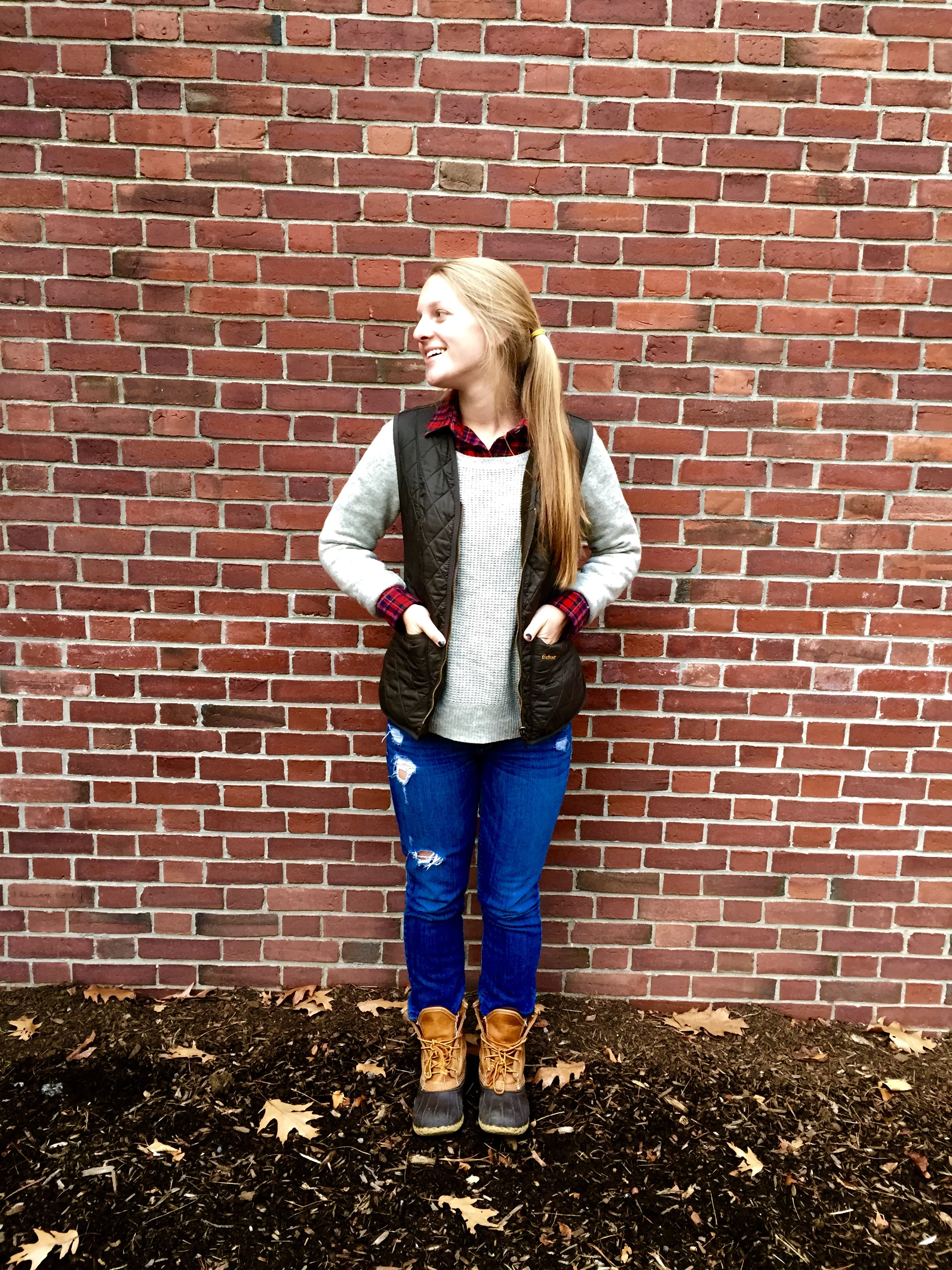 I was inspired by the J. Crew fall collection today and decided to try out the button down and pull over look. I wore a red, green and grey cozy flannel from Lucky and over that I layered my J. Crew grey long sleeved waffle sweater. I cuffed the flannel over the sweater and pulled the collar out from underneath it so that the flannel could be seen. I absolutely loved this look because it looked so polished and preppy but was also so comfortable and warm! I paired the sweater and flannel with a pair of distressed dark wash jeans, bean boots and my hunter green Barbour vest. I loved the addition of the dark wash jean and the bean boots mixed in with the hunter green and red of my flannel. This look was very all american prep school and something I am going to recreate over and over again!