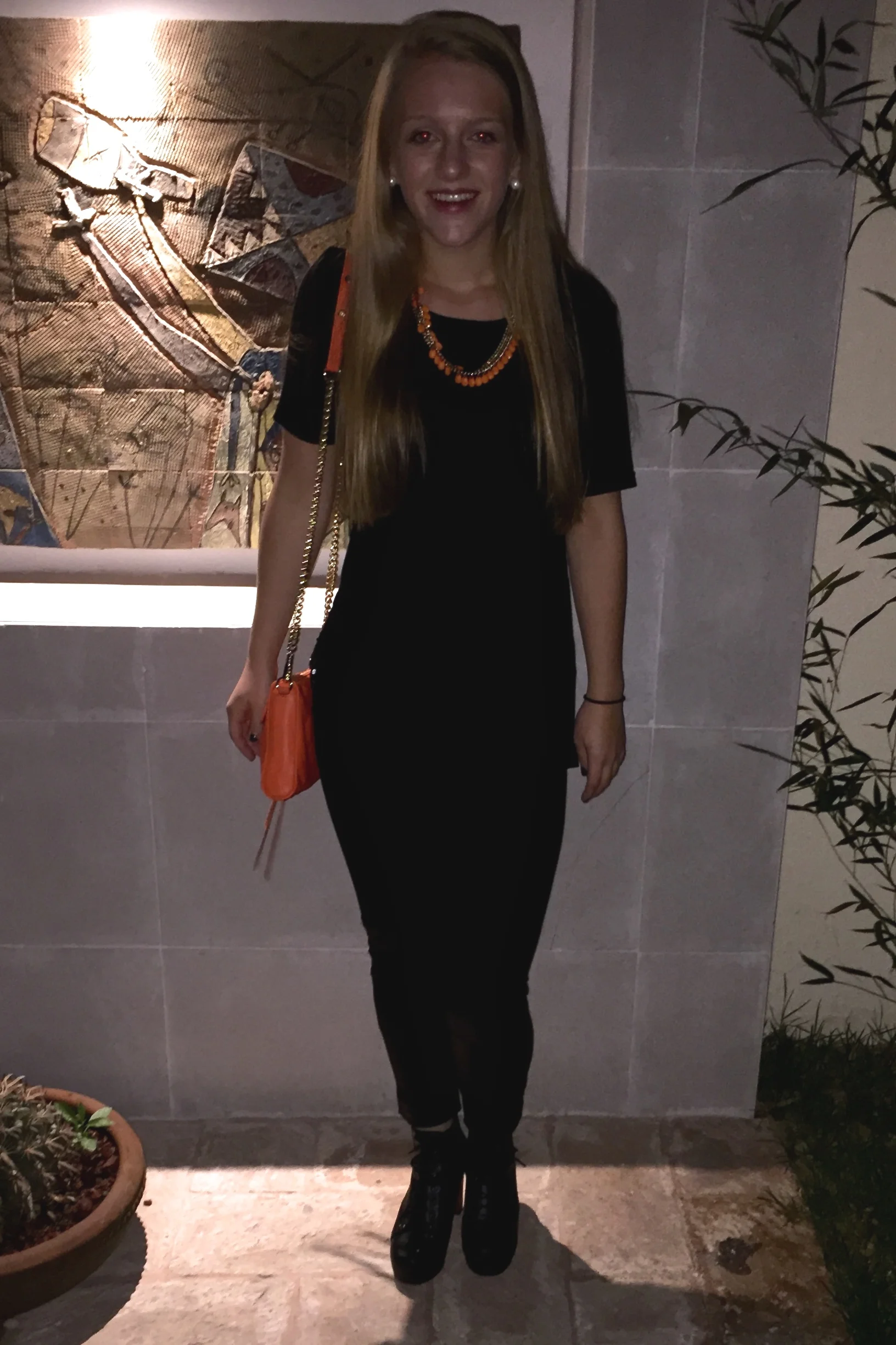 Need an outfit for a night out on the town? This is my new go to sophisticated glam look! It may look like black on black but my bag and my necklace add some bold color to the look. The floral spark detail on the back of my shirt adds a touch of glamour. For my shoes, I have on a pair of tall black lace up heel booties that I borrowed from my friend. The wooden heel adds some color to the all black shoe and the edgyness of the whole laces on heels look helped to even out the outfit. For pants, I have on a pair of black leggings that have faux leather up to the knees. I love these leggings because they are not only very cozy to wear, but they also are very flattering to any body type. The faux leather on the knees is a great addition to the pant and makes them unique from just your avarage leggings. For my shirt I have on a black  short sleeved high low shirt from J.O.A. The front of this shirt is made from what I think of as the softest material ever! However, my favorite part about this shirt is the back. The back of the shirt is embroidered with foral print sparkles! You would never expect it from the front, as it is so plain, but then when you turn around and the back is exposed it is such a nice suprise and gives a very glamourus effect to any look. For my accessories I borrowed a orange and gold statement necklace from my friend and paired my bright orange Rebecca Minkoff side bag with it. By adding these bright accessories to the outfit, it makes the front a little less plain and brings together the whole look! This outfit is a definite keeper.